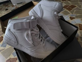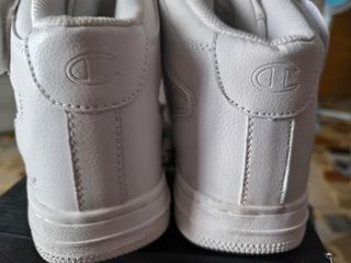 Zapatillas blancas mujer de marca champion con plataforma muy poco usadas tiene una pequeña mancha por dentro nose ve azul claro y por fuera en la suela la goma un hundimiento . Caja original .