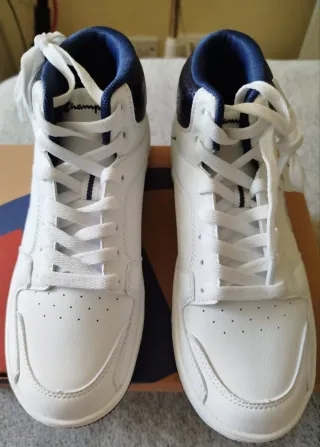 Zapatillas altas de la marca Champion en talla 39. Combinan el blanco con detalles en azul marino en el cuello y la lengüeta. - Cierre con cordones blancos. - Diseño deportivo y moderno.