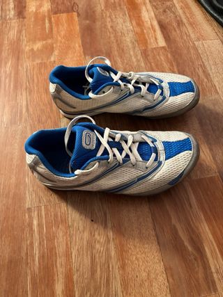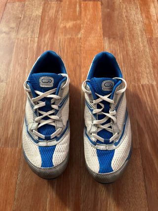 Zapatilla de clavos Kalenji en color azul y blanco. Suela con tacos Están algo usadas pero en muy buen estado