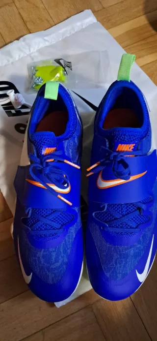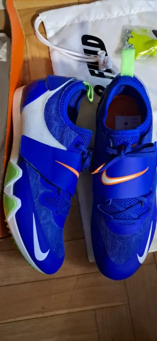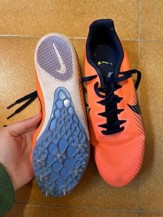 Zapatillas de atletismo Nike con clavos, ideales para competición. No estan gastadas pero estan puestas. - Color naranja y azul. - Diseño con suela de clavos para máximo agarre. - Logo de Nike visible en la suela y lateral.