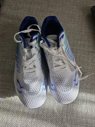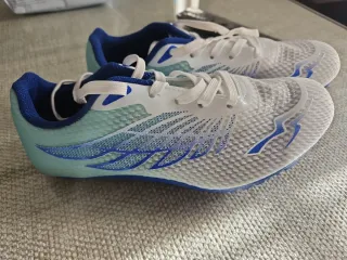 Zapatillas deportivas de clavos con un diseño moderno y llamativo. Solo puestas para probarlas, pero le están pequeñas. - Parte superior de malla transpirable. - Detalles en azul y blanco. - Cierre con cordones.