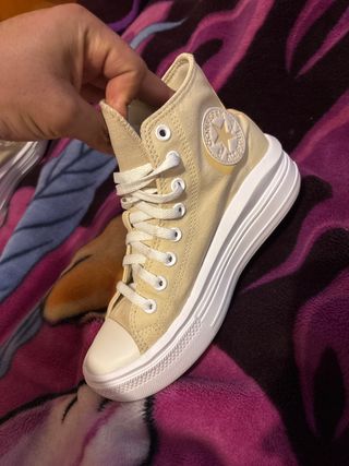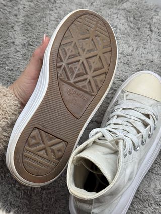 Deportivas Converse de estilo moderno, sin estrenar. - Color beige y blanco. - Diseño de caña alta. - Suela gruesa y plataforma. - Cierre con cordones.