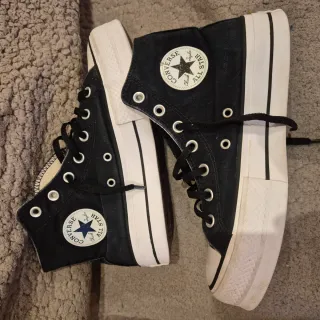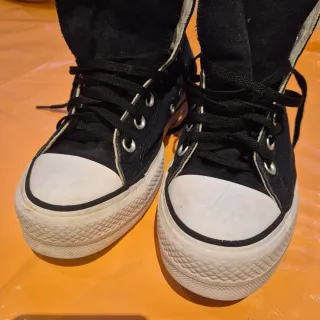 Zapatillas altas estilo Converse, perfectas para un look casual. - Diseño clásico en negro y blanco. - Cordones blancos. - Suela de plataforma.