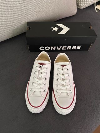 Zapatillas Converse bajas, a estrenar ( son como un 36 dan mucha talla) - Color blanco clásico. - Cordones blancos. - Suela de goma. - Detalle de líneas rojas y azules en la suela.