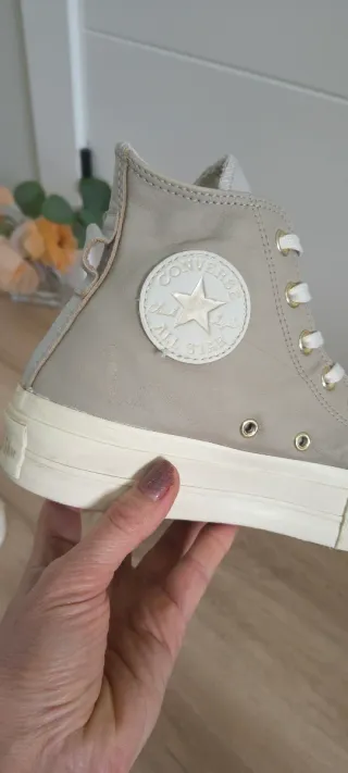 Zapatillas altas de la marca Converse en color beige. Diseño moderno y cómodo. - Cierre con cordones. - Suela gruesa y robusta. - Detalle en el talón.
