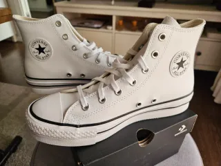 Deportivas Converse de estilo moderno, sin estrenar. - Color beige y blanco. - Diseño de caña alta. - Suela gruesa y plataforma. - Cierre con cordones.