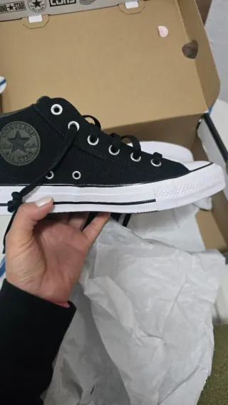 Zapatillas Converse de caña media para mujer. - Color negro con detalles blancos. - Cierre de cordones. Completamente nuevas en su caja,entrega en bac de roda y alrededores Otros puntos a coordinar Precio negociable