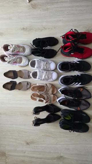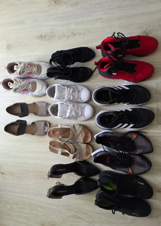 Vendo zapatos en buen estado: • Niño – talla 38–38,5 • Converse – talla 34 • Mujer negras con cadena – talla 37 • Resto de mujer – talla 36 Las zapatillas rojas y los zapatos negros de mujer con cadena están casi nuevos, apenas se han usado.