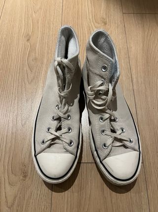 Zapatillas Converse tipo botín en color beige. Un clásico para cualquier ocasión. - Diseño de caña alta. - Cordones blancos. - Suela de goma. - Detalle de línea roja en la suela. Usados un par de veces solamente.
