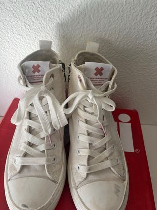 Vendo zapatillas deportivas blancas estilo Converse. Son de caña alta y tienen un diseño clásico. - Son de lona. - Están ligeramente usadas, pero en buen estado. - Ideales para un look casual.