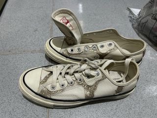 Me he pasado al calzado repetuoso y vendo mis zapatillas. Pack de zapatillas Converse All Star altas en color negro, color oro bajas y Vans de color crema con dibujos . Han tenido poco uso. Las vendo en pack las 3. El pack entero vale 50€, si quieres solo una o 2, el precio es el mismo - Converse negro de caña alta, talla 36 - Converse de color oro, talla 36 - Vans, talla 37
