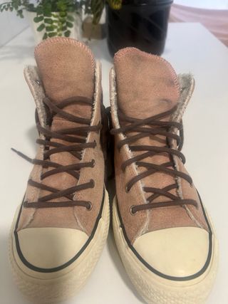 Zapatillas Converse de plataforma con exterior de piel. - Color rosa empolvado. - Forro interior suave. De borreguito muy calentitas - Cordones marrones. - Suela de plataforma.