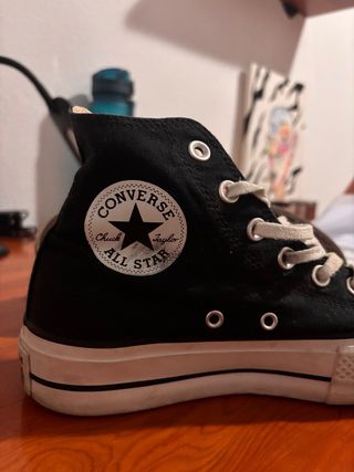 Zapatillas de caña alta en color negro con detalles blancos. No son converse originales. - Cierre con cordones blancos. - Suela de goma blanca. - Diseño clásico de Converse. Dan menos talla que una 41. Son como un 39. Sólo se usaron una vez.