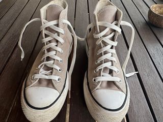 Zapatillas Converse All Star de color beige, casi nuevas. - Modelo de caña alta. - Suela gruesa y plataforma. - Cordones blancos.