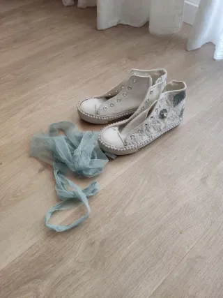 Zapatillas Converse de alta para comunión, con detalles de encaje y pedrería. - Color blanco roto. - Adornos florales y hojas. - Cierre con cordones.