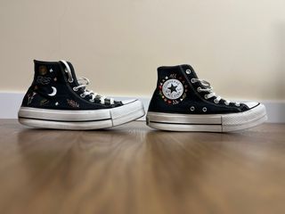 Zapatillas altas de la marca Converse con un diseño único. - Tejido con estampado de puntos blancos sobre fondo oscuro. - Suela de plataforma blanca. - Cordones negros. Tela con brillo. Son mas calentitas que las convencionales de lona. Talla 37,5.