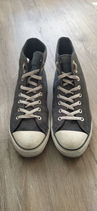 Zapatillas altas de la marca Converse en color gris sucio y blanco. Un clásico reinventado con suela gruesa. - Diseño de caña alta. - Cordones blancos. El color es gris claro sucio, tanto la tela como la plataforma . son así no es que estén sucias , usadas en una ocasión .