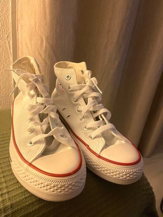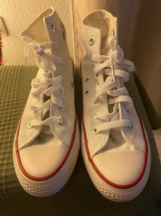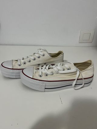 Converse de plataforma en color blanco talla 37. Tiene varios años de uso y el color ya no es tan blanco, como se ve en la imágenes el color es más amarillento. Tiene daños en la zona interior del talón como se ve en las imágenes. Los cordones no son los originales.