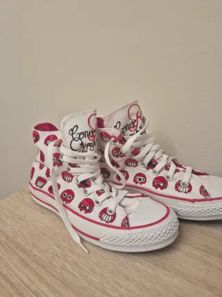 Zapatillas Converse de edición limitada con un divertido estampado. - Diseño exclusivo Supakitch. - Combinación de colores blanco y rojo. - Modelo de caña alta. Talla 36. Compradas en USA están nueva y sin uso (se compró otra talla por error). Dibujos muy divertidos edición limitada Converse x Supakitch. Suela y plantilla en perfecto estado. Se mandan en caja de cartón converse.