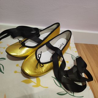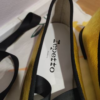 Preciosas y auténticas bailarinas Sophia, modelo icónico de la Maison Repetto. Ajuste perfecto con cinta de satén que aporta un estilo urbano con un toque de danza clásica, creando un look elegante y original. -Medida de largo interior: 26cm -Material: Piel napa ultra suave -Amarillo canario brillante (destellos dorados) -Plantilla de piel de vacuno -Forro de algodón -Suela de cuero -Fabricado en Francia -Incluye su bolso guardapolvo -No incluye caja, estaba demasiado dañada