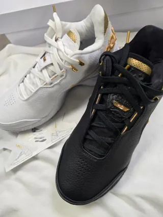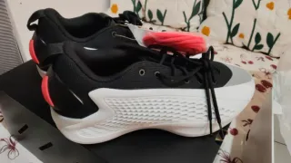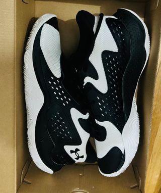 Zapatillas deportivas de baloncesto con un diseño moderno y llamativo. Usar 1 ves - Combinación de colores negro y blanco. - Logo de Under Armour visible.