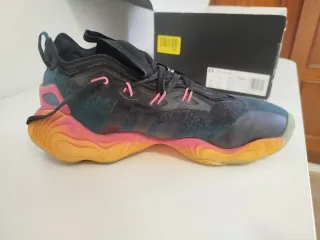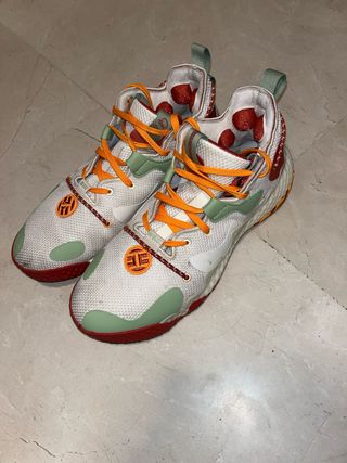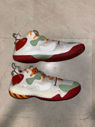 Zapatillas de baloncesto Adidas Harden Vol.6 en talla 46. Diseñadas para ofrecer un rendimiento óptimo en la cancha. Se han usado alguna vez y están en muy buen estado. - Parte superior de malla transpirable. - Amortiguación reactiva. - Suela de goma para un agarre superior. - Detalles de diseño inspirados en frutas.