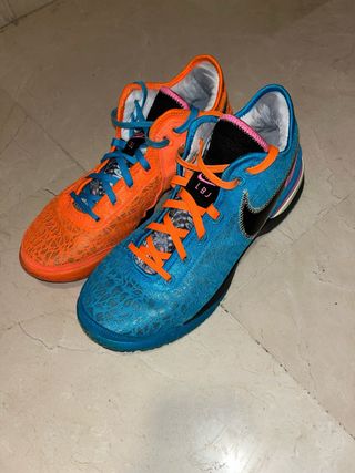 Zapatillas de baloncesto Lebron NXXT. Se han usado alguna vez pero están como nuevas. - Diseño vibrante en azul y naranja. - Cordones naranjas. - Detalle LBJ en la lengüeta.