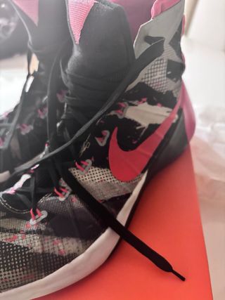 Zapatillas de baloncesto con un diseño llamativo. - Suela de goma con buen agarre. - Detalle de color rosa en el interior. - Cordones negros con punta rosa.