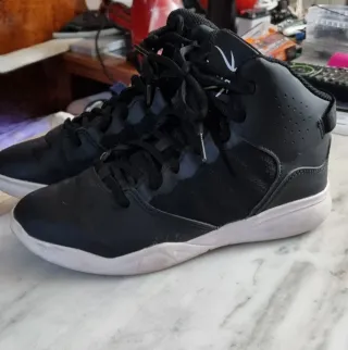 Zapatillas deportivas Jordan en color negro con detalles en rojo. - Cierre con cordones. - Diseño de caña alta. - Suela de goma. Esta en muy buen estado ningun daño, poco uso, y las vendo porque ya no me gusta usar este estilo de zapatillas pero estan muy bien cuidadas y traen con su caja