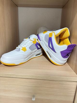 Zapatillas deportivas de la marca Jordan con un diseño llamativo. - Combinación de colores blanco, morado y amarillo. - Detalles de malla en los laterales. - Suela de goma. - Cierre de cordones.