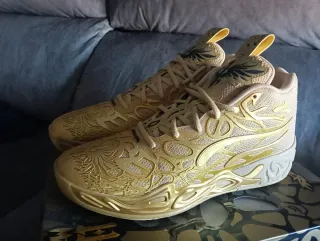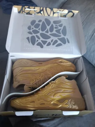 Zapatillas de baloncesto LaMelo Ball 04 con un diseño llamativo. - Acabado en color dorado y beige. - Detalles ornamentales grabados en la parte superior. - nuevas nunca usadas