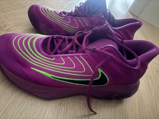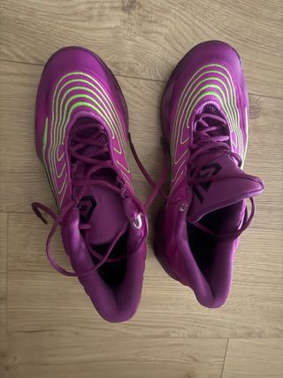 Zapatillas de baloncesto Nike con un diseño llamativo. - Combinación de colores morado y verde. - Cierre con cordones.