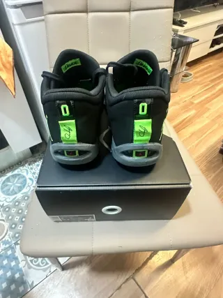 Zapatillas de baloncesto del jugador Anthony Edwards. Incluyen cordones negros y verdes. - Diseño en negro con detalles azules. - Cordones de repuesto incluidos.