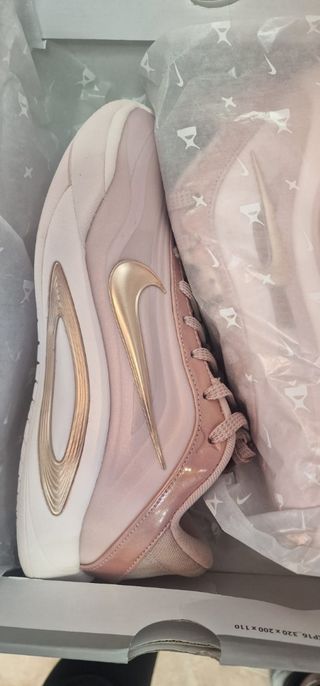 Zapatos de baloncesto para niña en talla 38. Un diseño llamativo en tonos rosa y dorado. - Cierre con cordones. - Detalle de logo Swoosh metálico. - Acabado brillante en algunas partes.