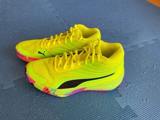 Zapatillas de baloncesto Puma con un diseño llamativo y vibrante. - Combinación de colores amarillo y detalles multicolor. - Estilo deportivo y moderno.