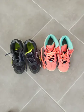 Tenis para baloncesto marca Tarmak de Decathlon en talla 36, en buen estado. Tenis negros talla 36 Artengo de Decatlón. - Zapatillas de caña alta en color salmón - Zapatillas de caña baja en negro y amarillo.