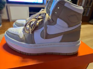 Zapatillas altas Nike Air Jordan 1 Elevate High en tonos beige y blanco. Un diseño icónico con un toque moderno. Usadas en 2 ocasiones. - Cierre de cordones y cremallera. - Detalle de swoosh en el lateral. - Suela de goma.