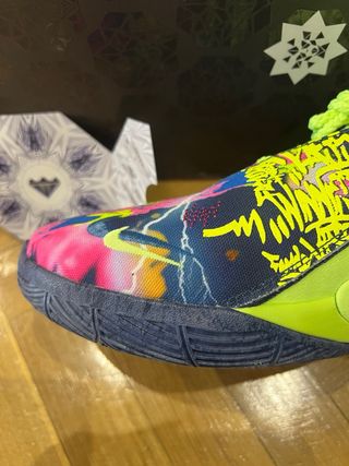 Zapatillas deportivas Nike Lebron XXII con un diseño vibrante y artístico. - Estampado multicolor y detalles llamativos. - Cordones en color verde lima. - Suela de goma resistente.