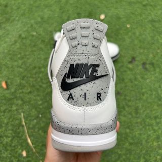 Zapatillas Jordan 4 con un diseño clásico. - Combinación de colores blanco y gris cemento. - Detalle de salpicaduras grises en la mediasuela y el guardabarros. - Malla texturizada en los paneles laterales y la lengüeta.