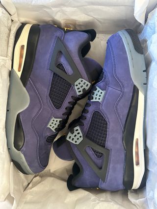Zapatillas Jordan 4 con un diseño inspirado en los Lakers. - Combinación de colores morado y gris. - Detalles en negro y crema. - Talla 46 -Nuevas