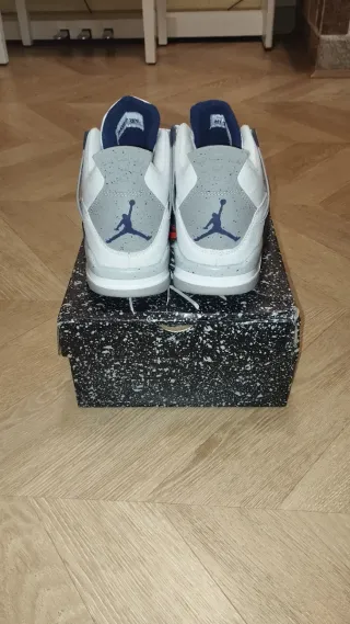 Zapatillas Air Jordan 4 en color blanco y azul marino. - Diseño con detalles en gris moteado. - Logo de Jordan en la lengüeta y el talón. - Cierre de cordones. - Suela de goma.