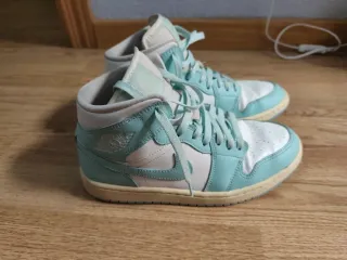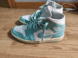 Zapatillas Nike Jordan de media caña. - Color principal verde azulado y blanco. - Cordones a juego. Son originales, su precio fue de 160€. Se las compramos a mi hija y se las habrá puesto 5 veces como máximo