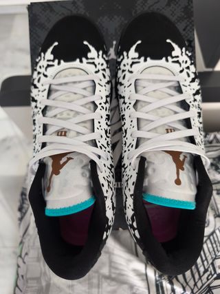 Zapatillas de baloncesto Puma con un llamativo diseño. - Estampado paisley en tono rosa y plateado. - Cordones y detalles en color rosa vibrante. - Raya lateral plateada con acabado brillante. - La talla esta en la foto pero es una 41 Las vendo porque me las compre creyendo que en verano iba a apuntarme a baloncesto, alfinal nada y me he gastado 100 euros para nada. Las he usado literalmente 3 veces están lógicamente perfectas.