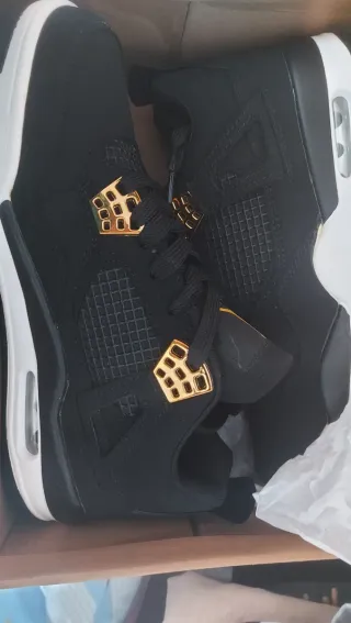 Air Jordan 4 Royalty – Talla 40 Modelo Jordan 4 Royalty en color negro con detalles dorados, muy elegante y fácil de combinar. Además de su diseño, son muy cómodas gracias a la amortiguación Air y a su buena sujeción, ideales para uso diario. ✔️ 100% originales ✔️ Estado: muy bueno ✔️ Talla: 40 ✔️ Cómodas y resistentes ✔️ Sin caja original (se enviarán bien protegidas) Cualquier duda, ¡escríbeme sin problema! 😊