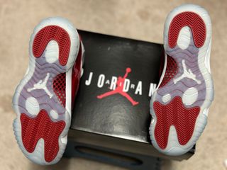 Zapatillas Jordan 11 con un diseño icónico. - Combinación de blanco y rojo. - Suela translúcida. - Cierre con cordones blancos.