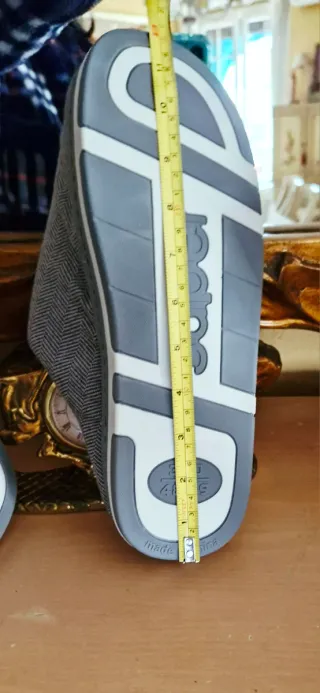 Zapatillas tipo zueco NUEVAS A ESTRENAR (abiertas por detrás) con diseño de espiga y forro muy cálido. Suela antideslizante. AVISO OBLIGATORIO SOBRE LA TALLA: En el apartado de "talla" del anuncio he marcado el número que figura en la suela porque la aplicación me obliga a ponerlo. Sin embargo, ese número no es real; las zapatillas tallan bastante menos. NO ACEPTO DEVOLUCIONES POR TALLA. He aportado fotos detalladas con una cinta métrica tanto del interior como de la suela. Por favor, guíese solo por las medidas de las fotos. Si tiene dudas, pregúnteme y le daré cualquier medida extra. Ideales para un look moderno o más clásico c