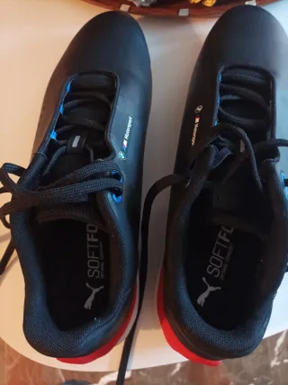 Zapatillas deportivas Puma con detalles de BMW. Sin llegar a estrenar. Sólo puestas en casa para probar, como uso plantillas especiales no me caben. - Diseño en color negro con detalles en rojo. - Cierre con cordones. - Logo de BMW Motorsport en el lateral.