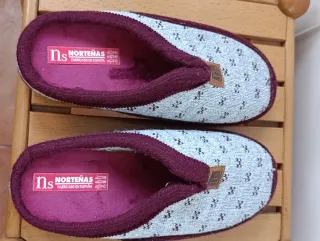 Comodísimas zapatillas de estar por casa de la marca Nortenas. Es una talla 39 pero como si fuera una 38. - Diseño tejido con estampado. - Ribete y forro interior en color morado. - Pequeña etiqueta de la marca en la parte delantera.