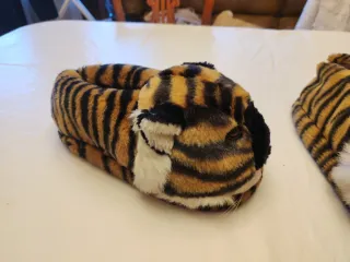 Comodísimas zapatillas de estar por casa con diseño de tigre. - Suaves y calentitas. - Detalle de orejas y rayas de tigre. - Talla 40 - Pequeño descosido en un talón, fácilmente reparable - Prácticamente sin uso