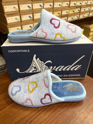 NUEVAS. Comodísimas zapatillas de estar por casa para mujer, con un diseño encantador de corazones. - Color celeste con detalles de corazones en rosa, morado y amarillo. - Tallas disponibles: 35, 36 y 40. - Marca Nevada. - Fabricadas en España. Últimos pares. También disponible talla 36 en Marino.